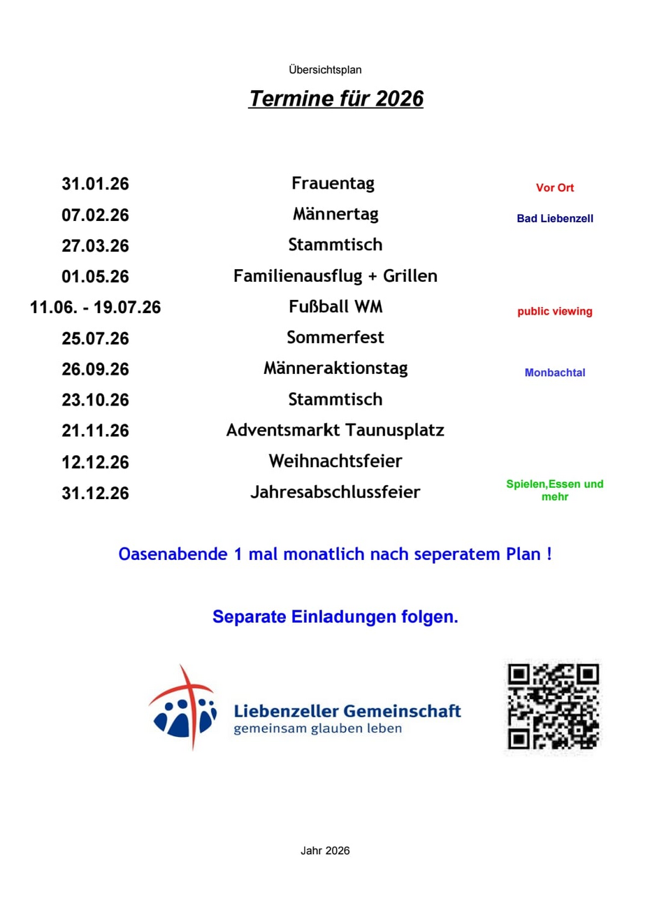 Unser Jahresplan mit den besonderen Terminen für 2026: